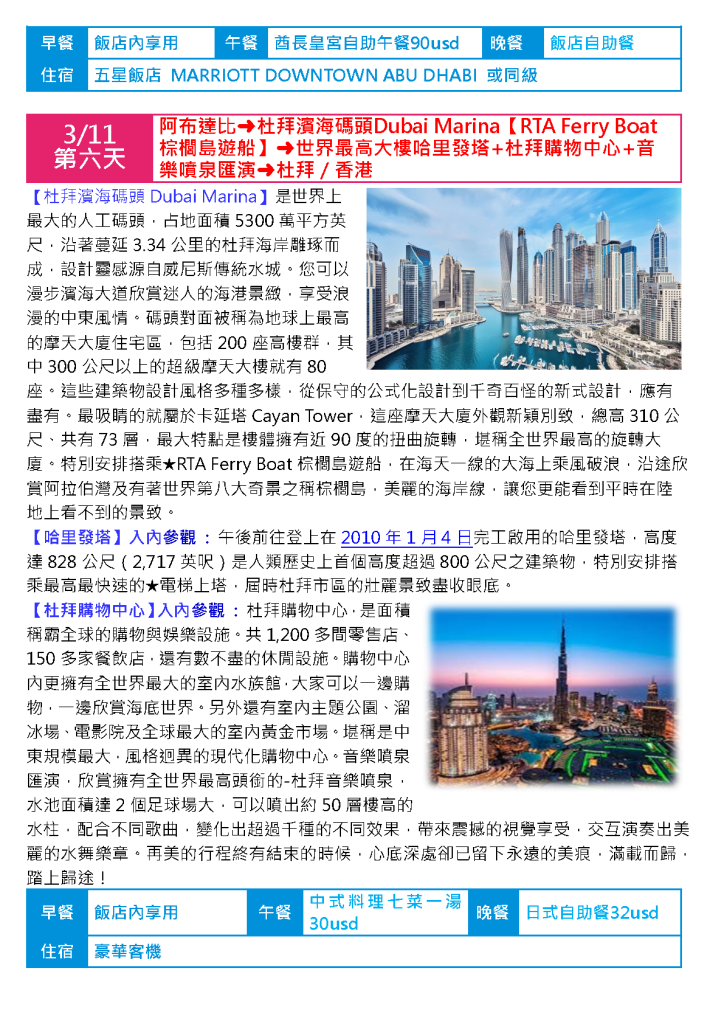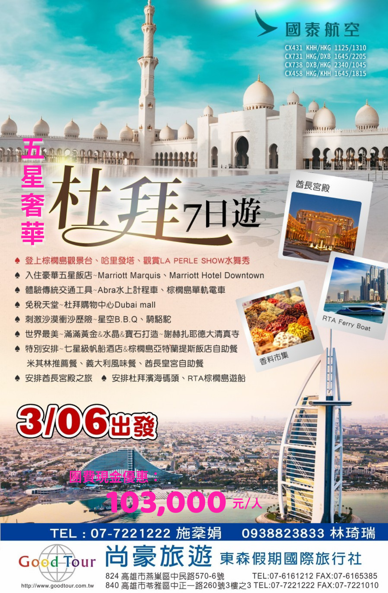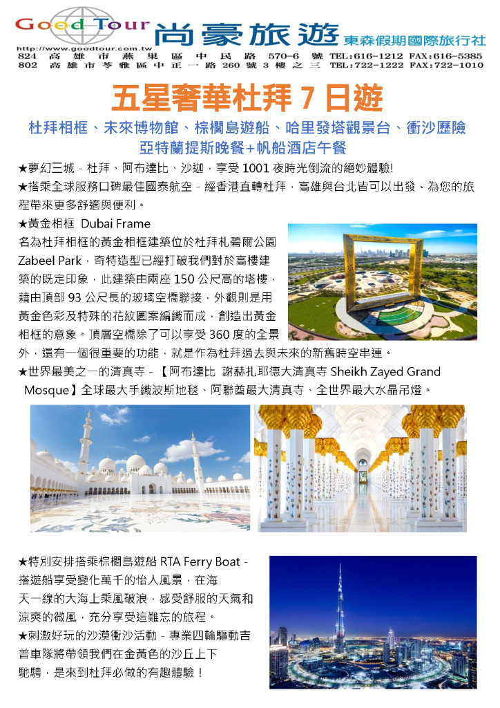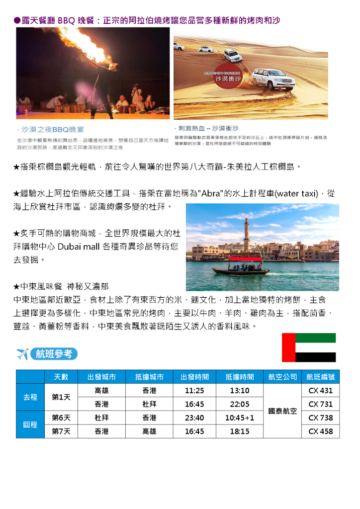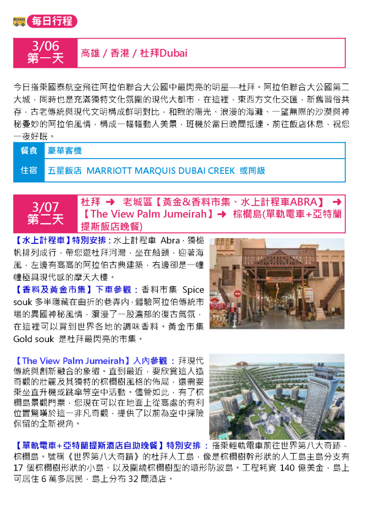 【 2026/03/06~12】奢華杜拜7日 高雄直飛 已成團 團費包含全程小費及接送(接送車程為1小時內或65公里內原則上接送;若超過則會補助費用自行前往機場) 以下行程僅供出發前旅客參考,正確行程、航班及旅館依行前說明會資料為準。 21 Likes