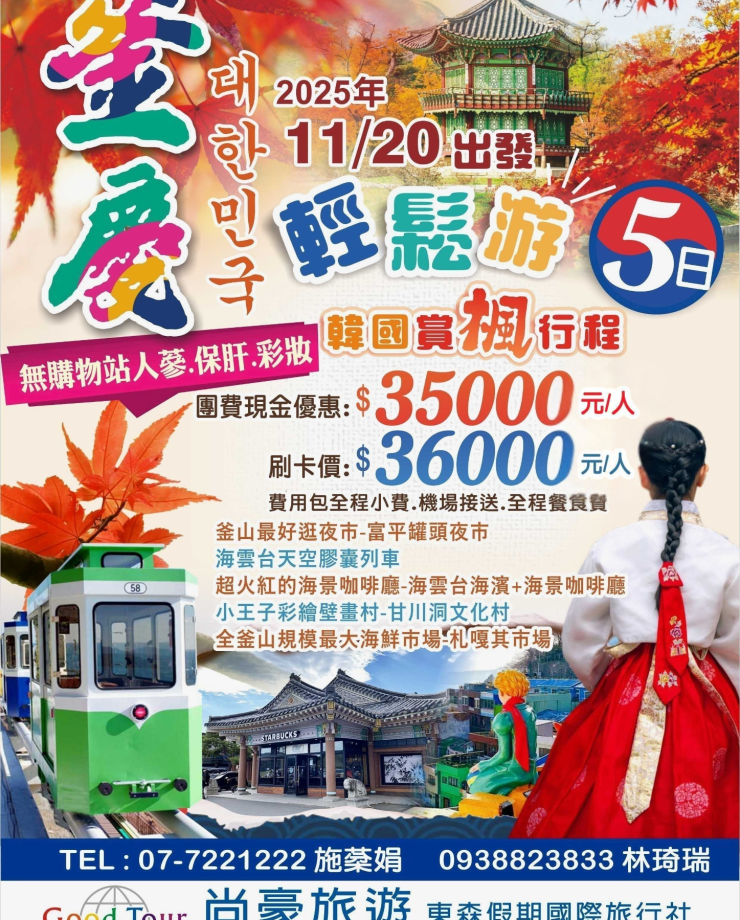 【 2025/11/20~11/24】釜山+慶洲賞楓5日(全無購物)